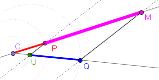 Como $ \bigtriangleup [OPU] \equiv \; \bigtriangleup [OMQ] $, temos que: $\frac{\overline{OP}+\overline{PM}}{\overline{OP}} = \frac{\overline{OU}+\overline{UQ}}{\overline{OU}} $ ou seja, $\frac{\overline{OP}}{\overline{OP}} + \frac{\overline{PM}}{\overline{OP}}= \frac{\overline{OU}}{\overline{OU}}+\frac{\overline{UQ}}{\overline{OU}} \Leftrightarrow 1 + \frac{\overline{PM}}{\overline{OP}}= 1 +\frac{\overline{UQ}}{\overline{OU}} \Leftrightarrow $ $\Leftrightarrow \frac{\overline{PM}}{\overline{OP}}= \frac{\overline{UQ}}{\overline{OU}}$ e como $\small{ \overline{OU} =1} $ $ \frac{\overline{PM}}{\overline{OP}}= \frac{\overline{UQ}}{1} \Leftrightarrow \frac{\overline{PM}}{\overline{OP}}= \small{\overline{UQ}} \Leftrightarrow \small{\overline{PM}=\overline{OP} \times \overline{UQ}}$ |