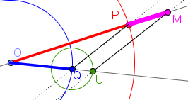 Como $ \bigtriangleup [OPQ] \equiv \; \bigtriangleup [OMU] $, temos que: $\frac{\overline{OP}+\overline{PM}}{\overline{OP}} = \frac{\overline{OQ}+\overline{QU}}{\overline{OQ}} $ ou seja, $\frac{\overline{OP}}{\overline{OP}} + \frac{\overline{PM}}{\overline{OP}}= \frac{\overline{OQ}}{\overline{OQ}}+\frac{\overline{QU}}{\overline{OQ}} \Leftrightarrow 1 + \frac{\overline{PM}}{\overline{OP}}= 1 +\frac{\overline{QU}}{\overline{OQ}} \Leftrightarrow $ $\Leftrightarrow \frac{\overline{PM}}{\overline{OP}}= \frac{\overline{QU}}{\overline{OQ}}$ e como $\small{ \overline{QU} =1} $ $ \frac{\overline{PM}}{\overline{OP}}= \frac{1}{\overline{OQ}} \Leftrightarrow \small{\overline{PM}} \normalsize= \frac{\overline{OP}}{\overline{OQ}}$ |